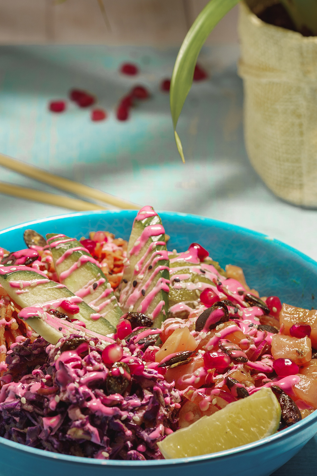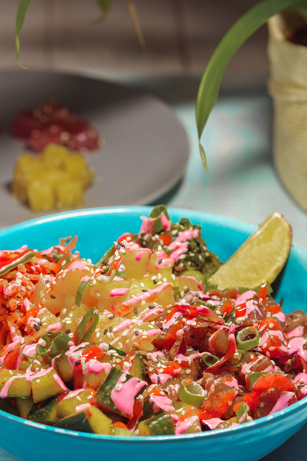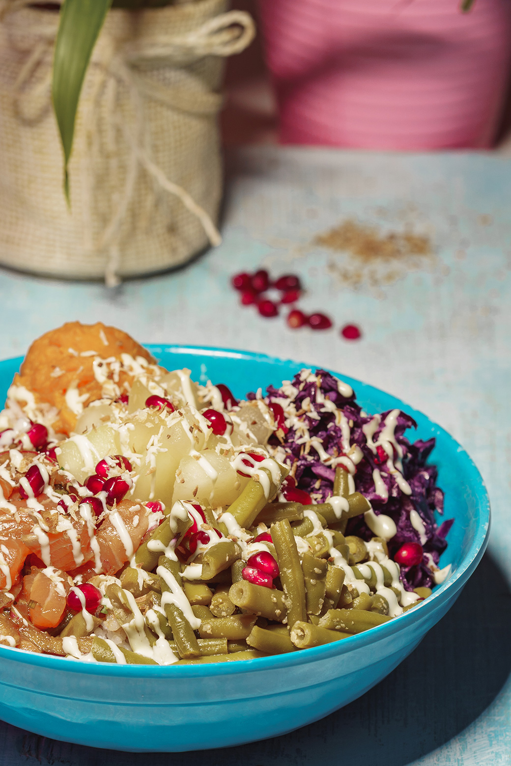 Atlantik Lachs, Orange-Ponzu, Reis, Island Coleslaw, Mango, Süßkartoffel, Lu’au Bohnen, Granatapfelkerne, Kokosflocken, Birnen-Wasabi Mayo