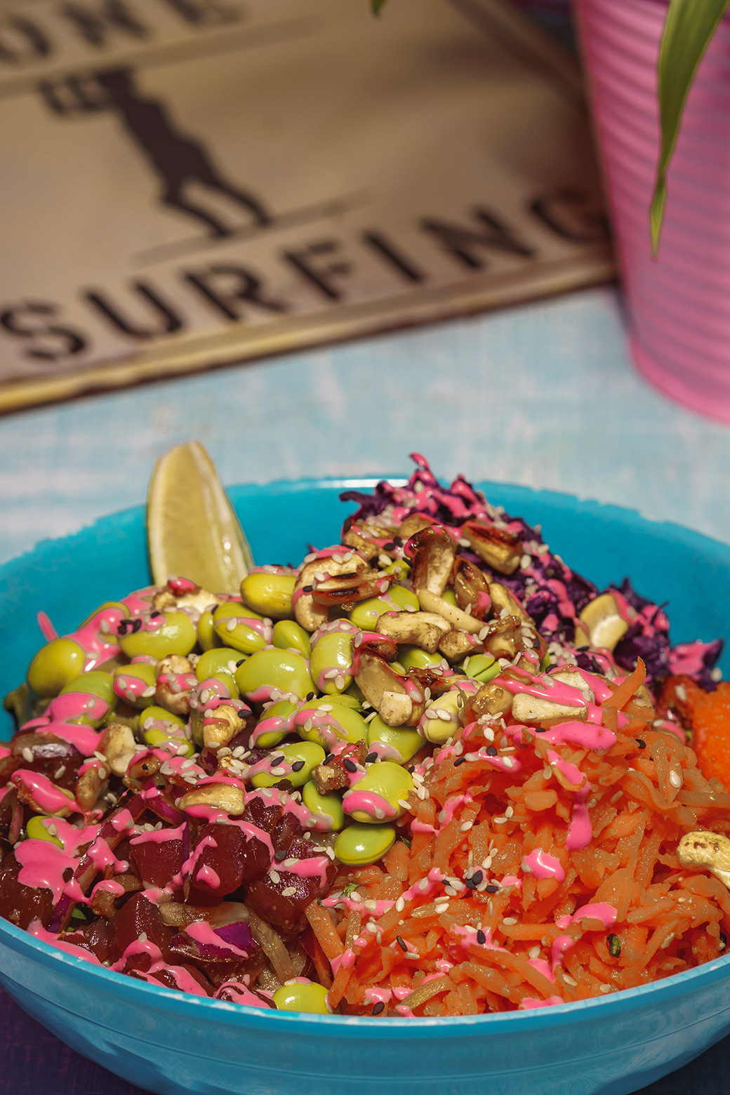 Ahi Tuna, Truffle Shoyu, Haiku Möhren, Island Coleslaw, Avocado, Edamame, Cashewkrokant, Masago, Pink-Wasabi Mayo