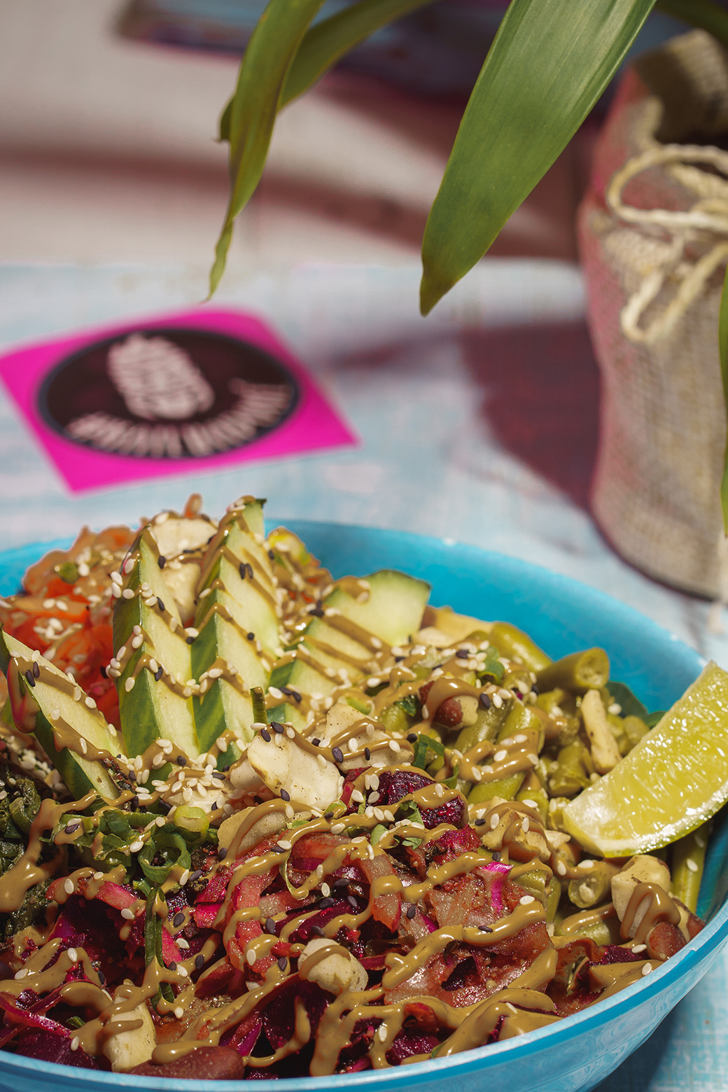 Rote Beete, Orange Ponzu, Haiku Möhren, Lu’au Bohnen, Gurke, Soisam Spinat, Frühlingszwiebel, Paranüsse, Shoyu-Erdnuss Mayo